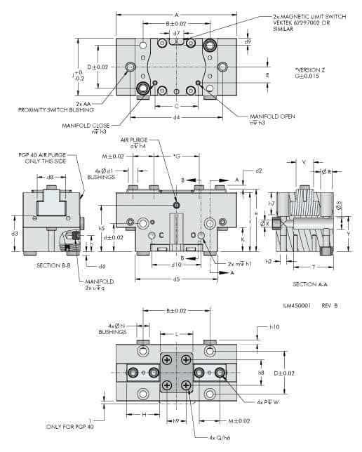 - Includes mounting locations for proximity and magnetic switches.