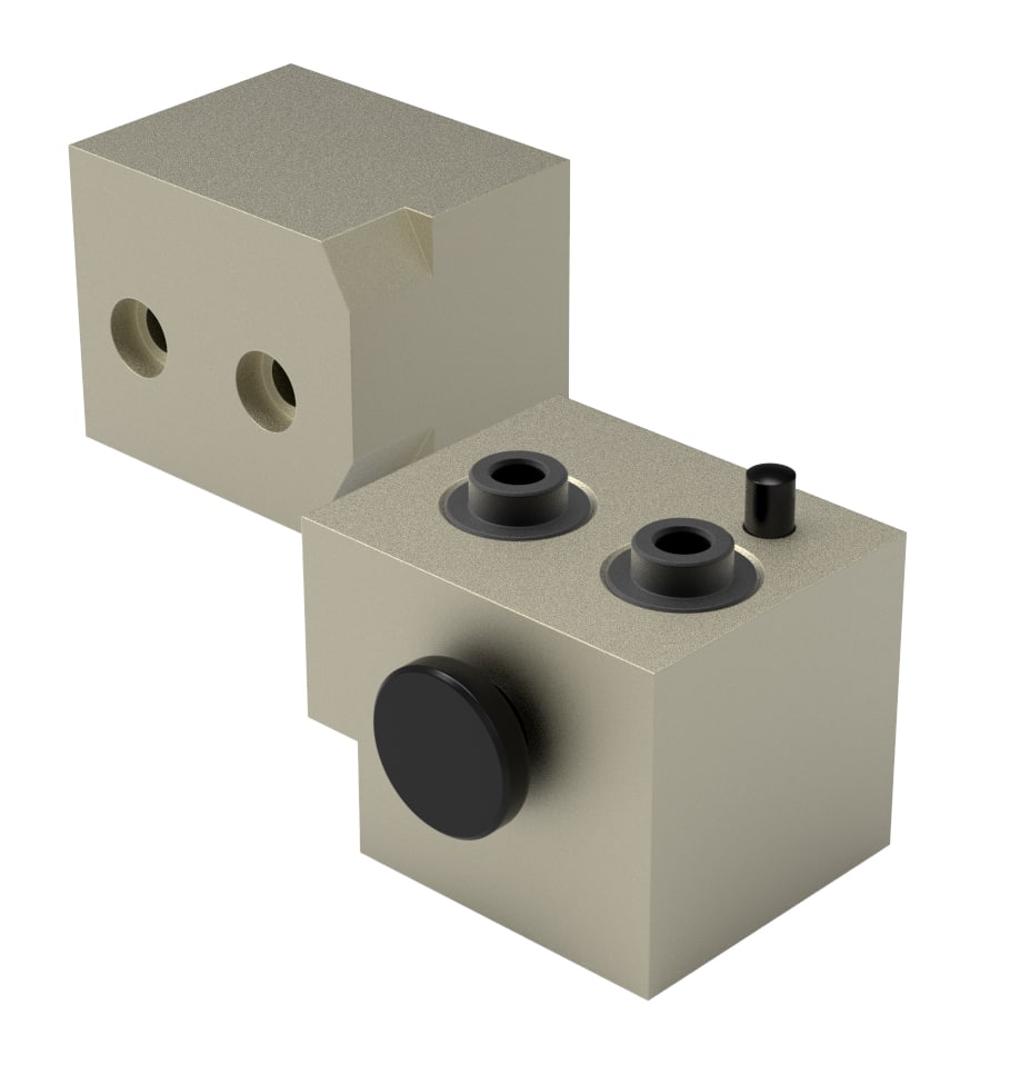 The VY quick-change jaw system enables the fingers to be rapidly changed on the gripper using a simple push button, requiring a base (VY-B) and adapter pin pair (VY-A) for each gripper jaw. The VY base is bolted to the gripper jaws and the two adapter pins are fastened to the fingers. The height tolerance of the base is +/- 0.05 mm and the repeatable accuracy of the top jaw using this system is +/-0.02 mm.