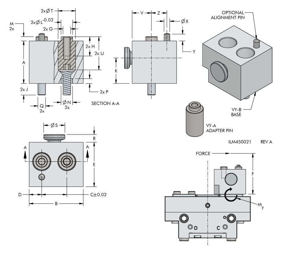 | Model No. | A | B | C | D | E | G | H | J | K | L | M | N | P | Q | R | Weight (Kg) | Max Force (N) | My (Nm) | S | T | U | V | X | Y | Z |