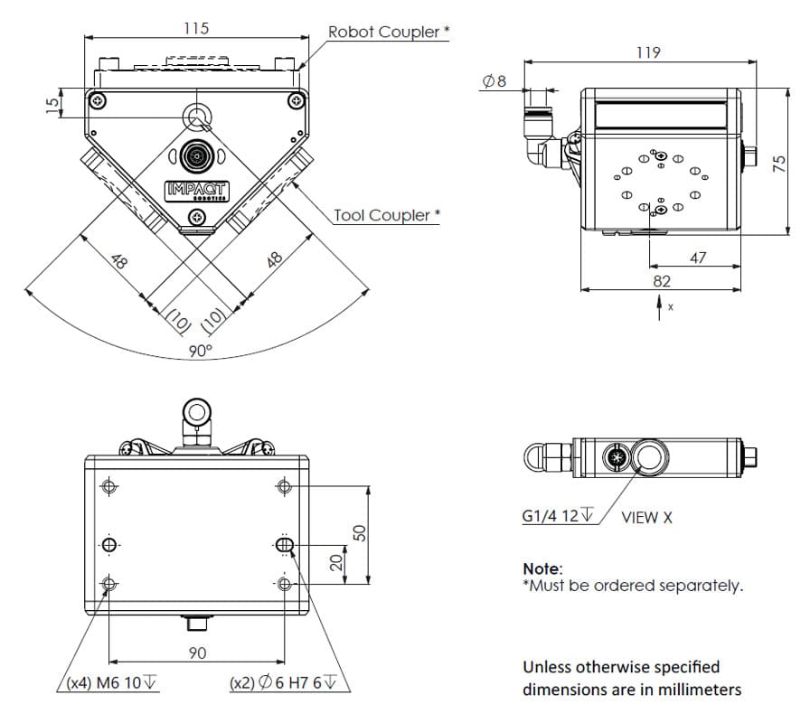 | 61020122 | 2 | 90° | - | 1 | 2 | <30 ms (Modbus RTU) | Compressed Air | 580g / 1.3lbs | 3.5 kg / 7.7 lbs | 5 kg / 11 lbs | 85 slpm / 3 scfm | 230 slpm / 8.1 scfm | N/A | URCap | Modbus RTU (RS-485) | M8 8 pin female connector | Ø8 mm tube quick connector | m8 3pin female connector | G 1/4 female thread | pneumagiQ Robot Coupler | pneumagiQ Tool Coupler | 24V DC | 450 mA | +5°C to 50°C / 41°F to 122°F | <50 dB | IP65 |