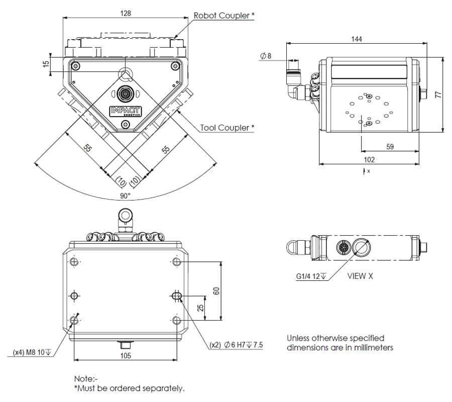 | Model No. | Mountable pneumatic EOAT | Angle between EOAT | Range Extension | Air blow-off ports | Sensor connectors | Response Time | Operating medium | Weight (Kg) | Max Payload per Tool Mounting Face | Overall payload | Airflow rate for EOAT | Airflow rate at Auxiliary port (Air blow-off) | Max. Operating Pressure | Universal robots | Other robots / controllers | I/O Connector | Air Inlet | Sensor port | Air Blow-off Port Type | Robot Mounting | Tool Mounting | Operational Voltage | Nominal operational current | Ambient Temperature Range | Noise Level | Ingress protection |