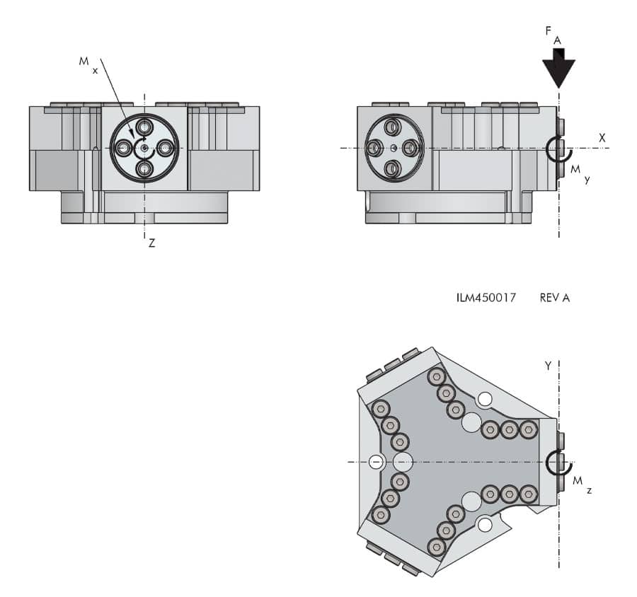 The shown force and moments are applied per base jaw and may occur simultaneously. My may apply separately to the moment generated by the gripping force itself.
