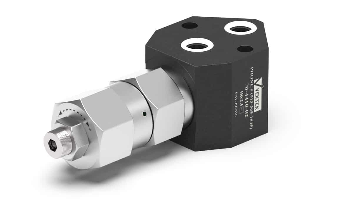 OPERATION: The VektorFlo® sequence valve operates as a pressure sensitive, normally closed element in a clamping system. When fluid first enters the system at low pressure, the valve is closed, blocking the flow of fluid to devices downstream. After devices in the other branches of the system have moved into position, the pressure begins to increase. The increasing pressure overcomes the spring force holding the valve closed, forcing the poppet off its seat and allowing fluid flow through the valve. After all devices have positioned and clamped, the downstream pressure increases to equal upstream pressure. Pressure throughout the system will increase to the maximum setting on the hydraulic power supply. When unclamping, as pressure falls, force from the adjustment spring pushes the poppet back onto its seat. Fluid trapped in the downstream circuit flows back through the check seat to return to the power unit reservoir.