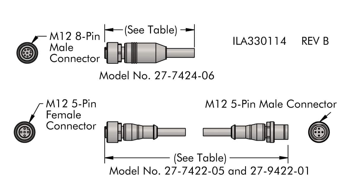 | 27-7424-06 | Cable, M12 8-Pin Master Control Unit Pallet ID Machine Tool Interface Cable* | Male Straight | N/A | 16.4 |