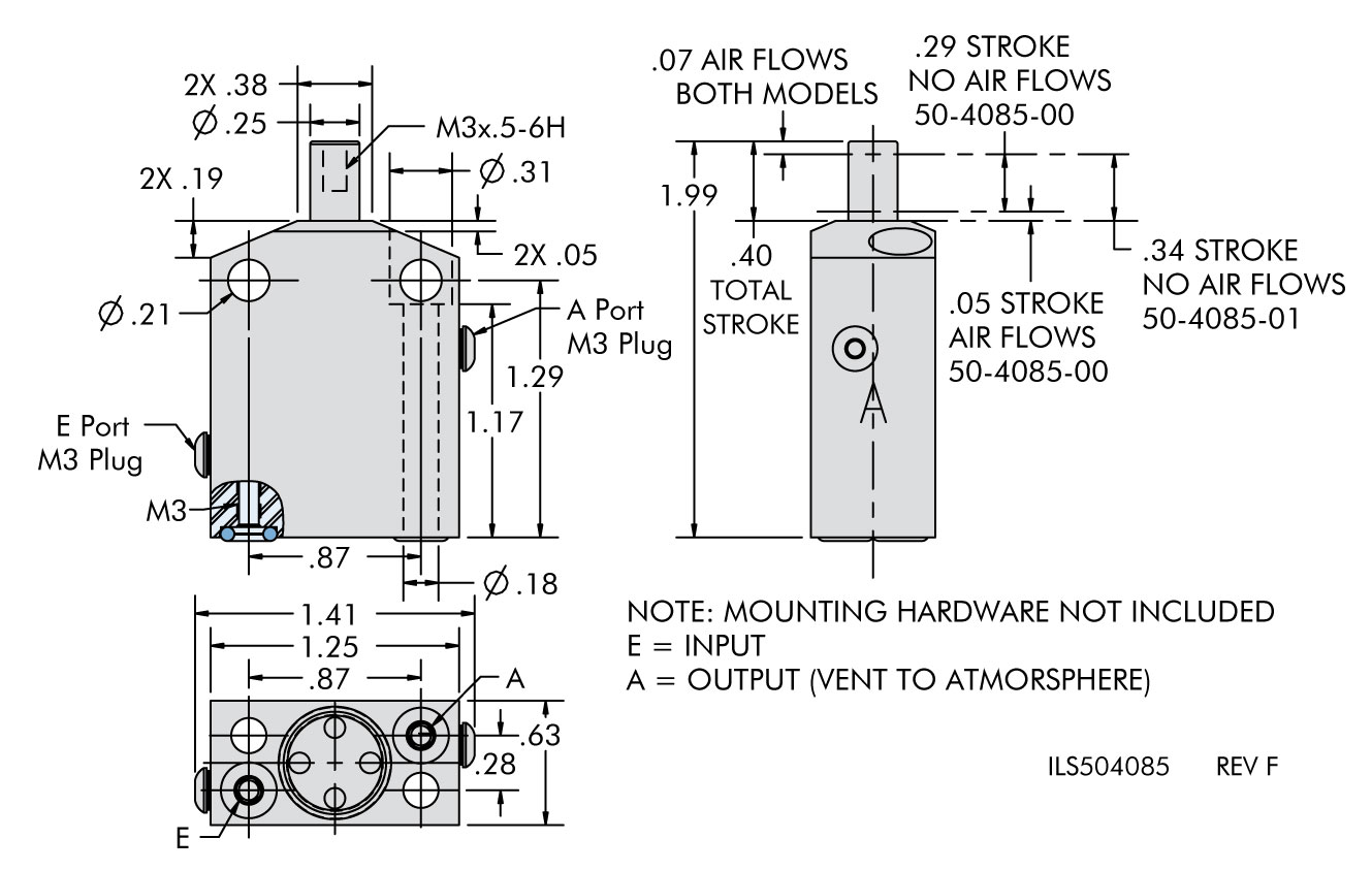 | 50-4085-01 | PNEUMATIC CONFIRMATION VALVE BLOCK, STANDARD | 145 | 10 - 70 | 0.354 - 0.706 | Min. 12 | Min. 45 | 0.40 Max | 1.5 - 3 | 0.079 | Manifold & M3 |