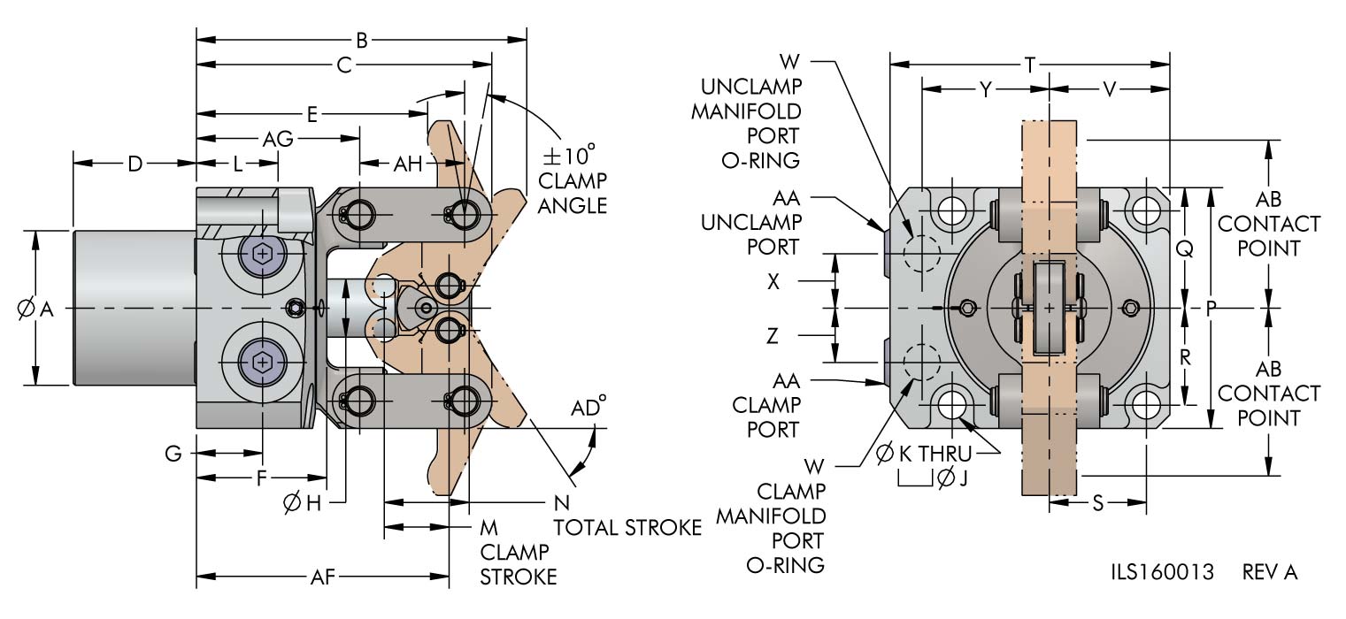 * Clamp capacities are listed at 5,000 PSI maximum operating pressure with a standard length link clamp lever installed. Total clamping force is divided equally between each side. Minimum operating pressure is 500 PSI for double acting. The clamping force is adjustable by varying the hydraulic system pressure. Use of an extended length lever will result in a reduction of clamp force. (Actual force will vary slightly due to mechanical inefficiencies, and friction.)
