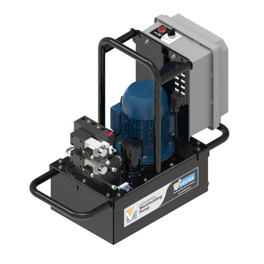 Vektek’s NEW LOW PRESSURE Advanced Workholding Pump is an efficient ON DEMAND pump with NO DUTY CYCLE limitations due to it’s Variable Frequency Drive (VFD). Once pressure is met, the pump turns off while holding pressure, if a pressure decay occurs the on-demand pump will re-start and build pressure to the correct pressure setting.