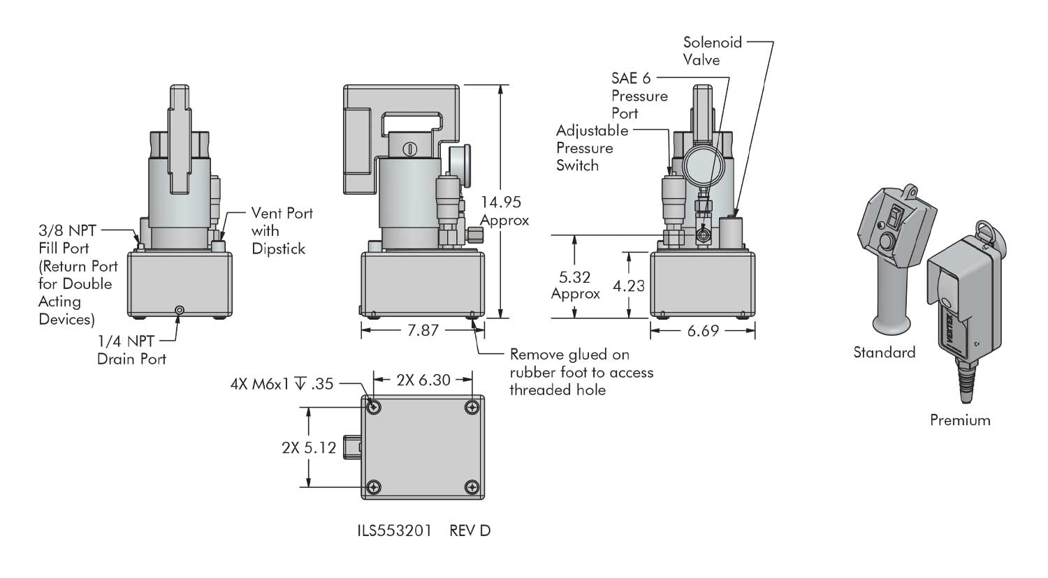 | 55-3221-32 | Standard | Single Acting or Double Acting | 2 Way 3 Port Electric | Advance - Hold - Release | 1/3 HP - 115V/7 amp 1 ph - 50/60 Hz | 120 cu. in. (100 psi) / 12 cu. in. (5000 psi) | Gross - 122 cu. in. / Useable - 108 cu. in. |