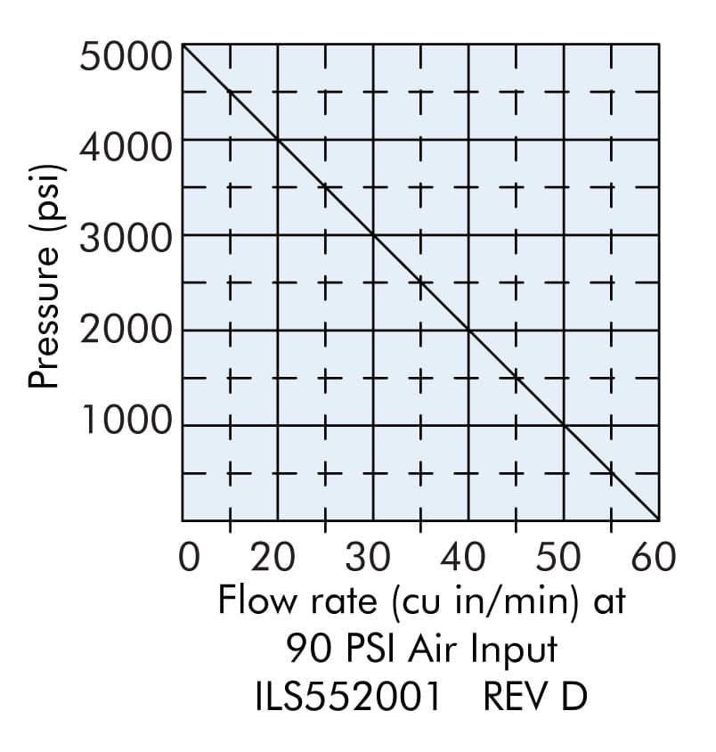 - Built in air regulator adjusts to determine hydraulic output pressure from 1,200 to 5,000 psi.