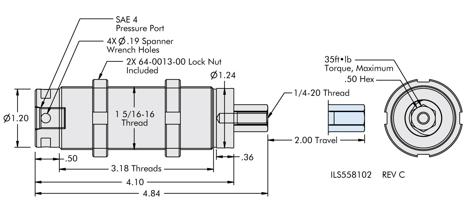 - Heavy duty threaded screw can be driven by a precision nut runner for fast and precise actuation (maximum RPM = 500).