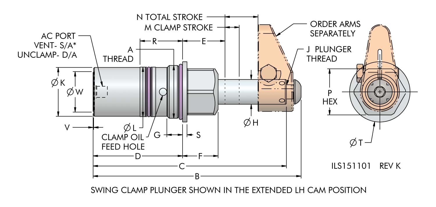 | Model No. | Swing Direction | Clamp Capacity (lb.) | Vertical Clamp Stroke (in.) | Total Stroke (Swing + Vertical) | Body Thread | Standard Arm Length | Piston Area (sq. in.) Retract | Oil Capacity Extend (cu. in.) | Oil Capacity Retract (cu. in.) |