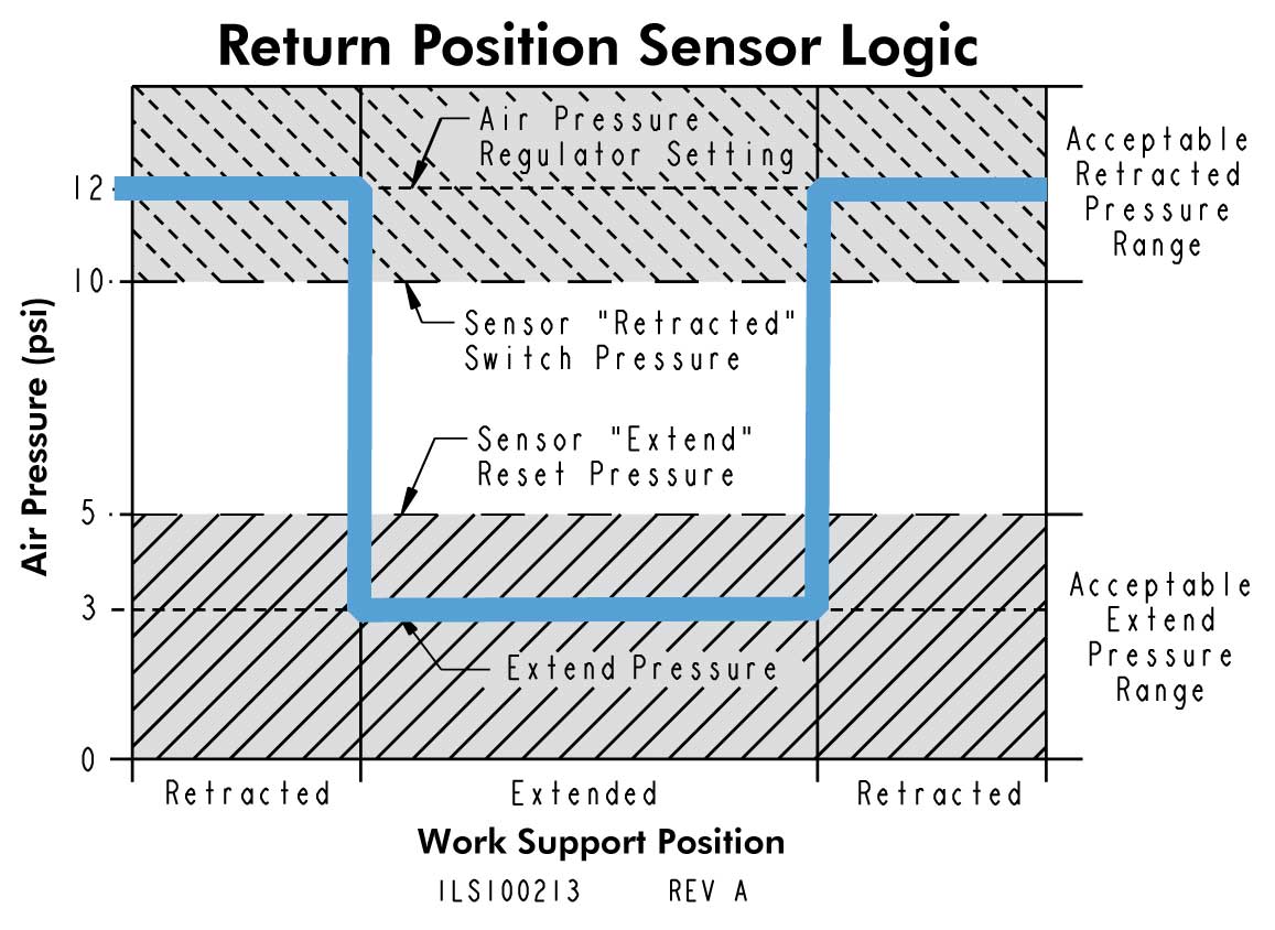 - The Return Position Sensors use air pressure to communicate that the work support has retracted and that the fixture can be unloaded/loaded.