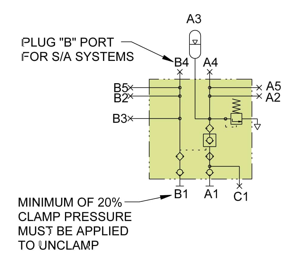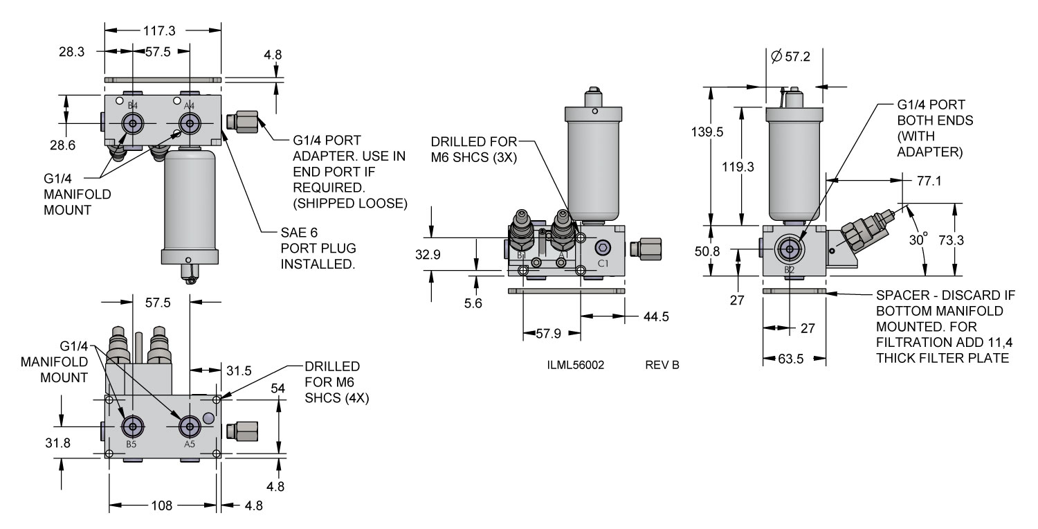 - Internal 25 micron filters for added protection of pilot operated check valve thru ports A1, A2, A3, A4 & C1. Additional filtration provided at port B1. (Filtration for A3, B3 or A4, B4 available by purchasing Vektek filter block L7-0842-05 or L7-0842-06 depending on mounting orientation.)