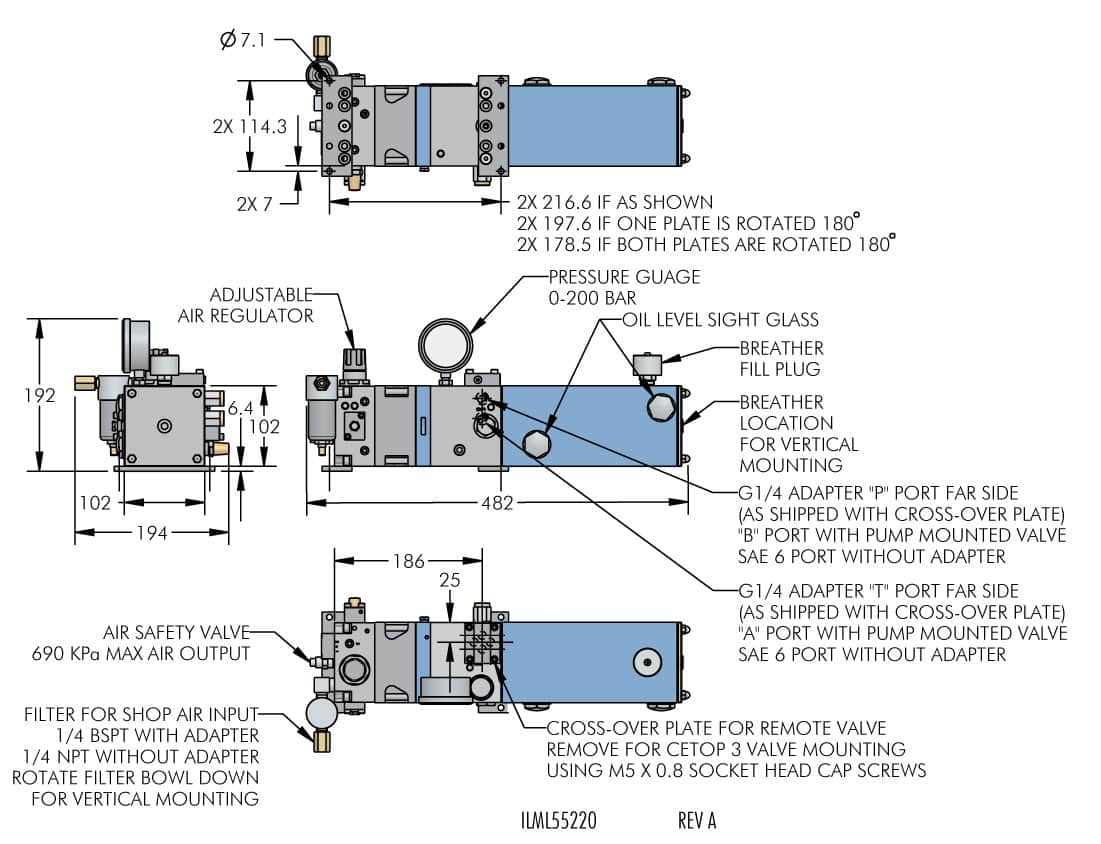 | L5-5222-00 | 20/20:1 | Horizontal (shown)/Vertical (reservoir up) | 1.4 L | 1.9 L | 100 kPa | 550 kPa | 2.0 - 10.0 MPa | 10 kg |