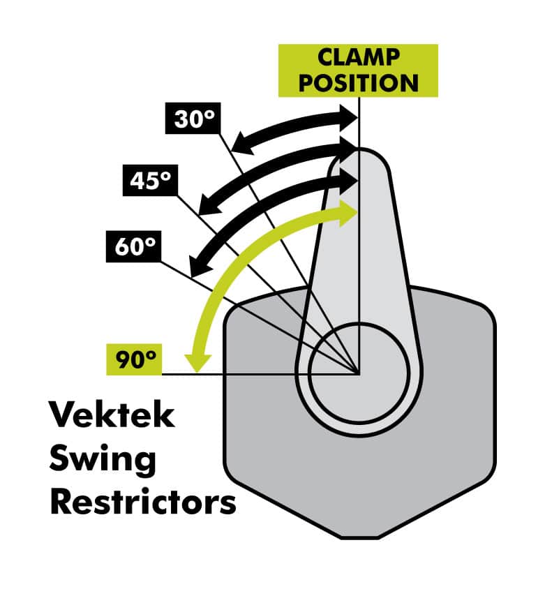 Swing Clamps developed to meet your demand for high-speed, precise positioning and/or heavy arm applications in a 7MPa operating pressure environment. One of the keys to this innovation is the patented spring loaded TuffCam™ design that was developed to improve strength and wear. Using the patented Vektek V-Groove, a stainless steel ball seat, these clamps have reduced static friction for improved clamp breakaway and reduced dynamic friction for improved life. This combination adds up to producing the most accurate and repeatable swing clamp cam assembly.