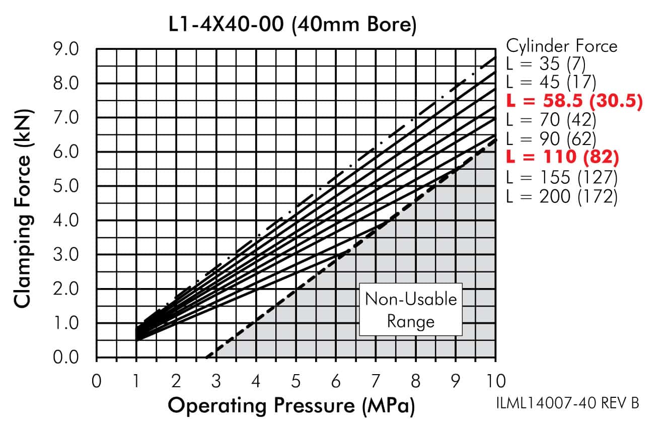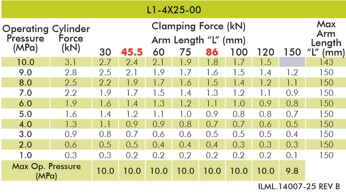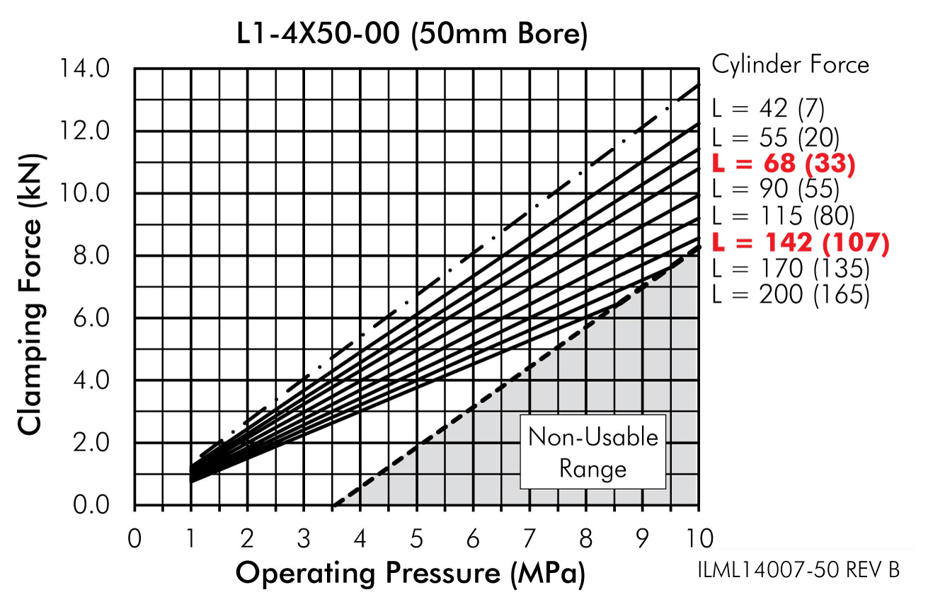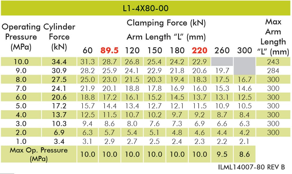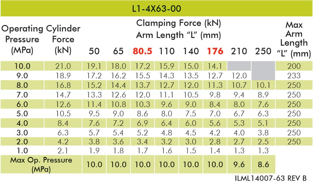 - The tables and graphs show the relationship between arm length, operating pressure and clamping force.