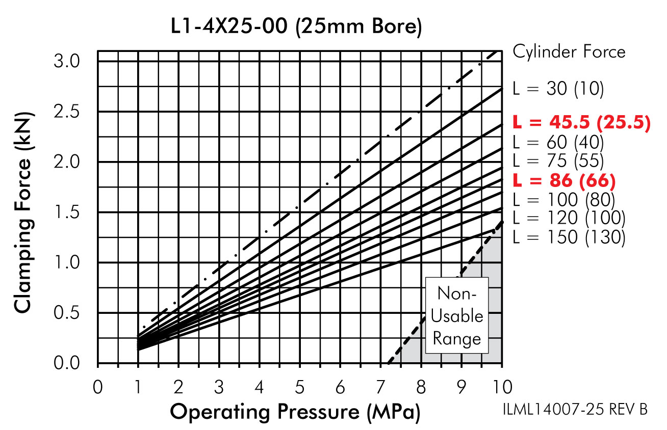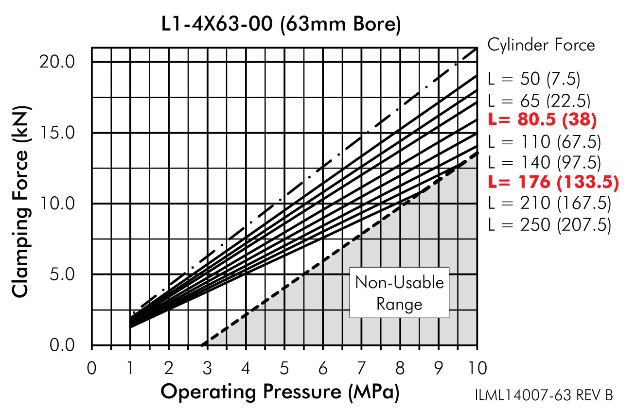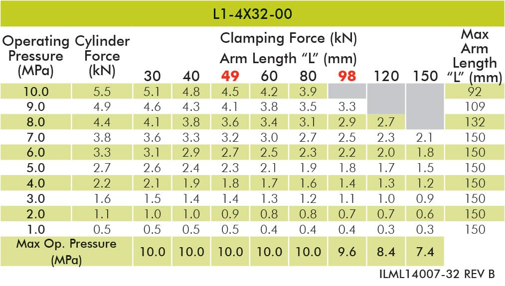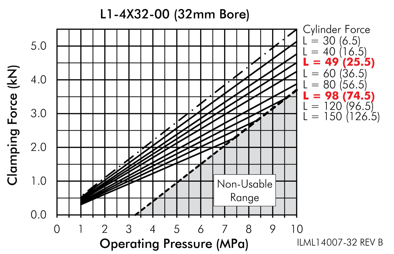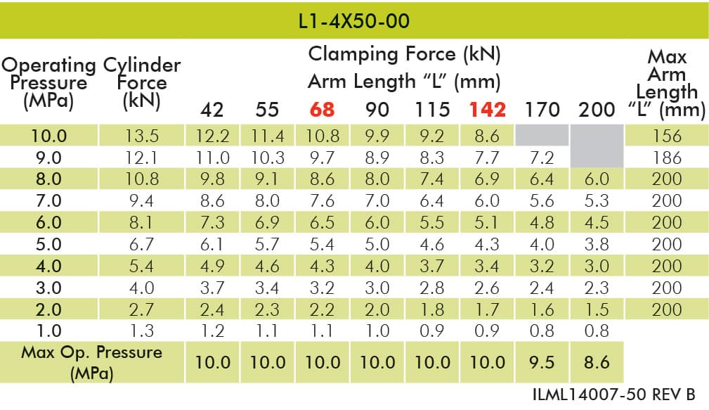 - The tables and graphs show the relationship between arm length, operating pressure and clamping force.
