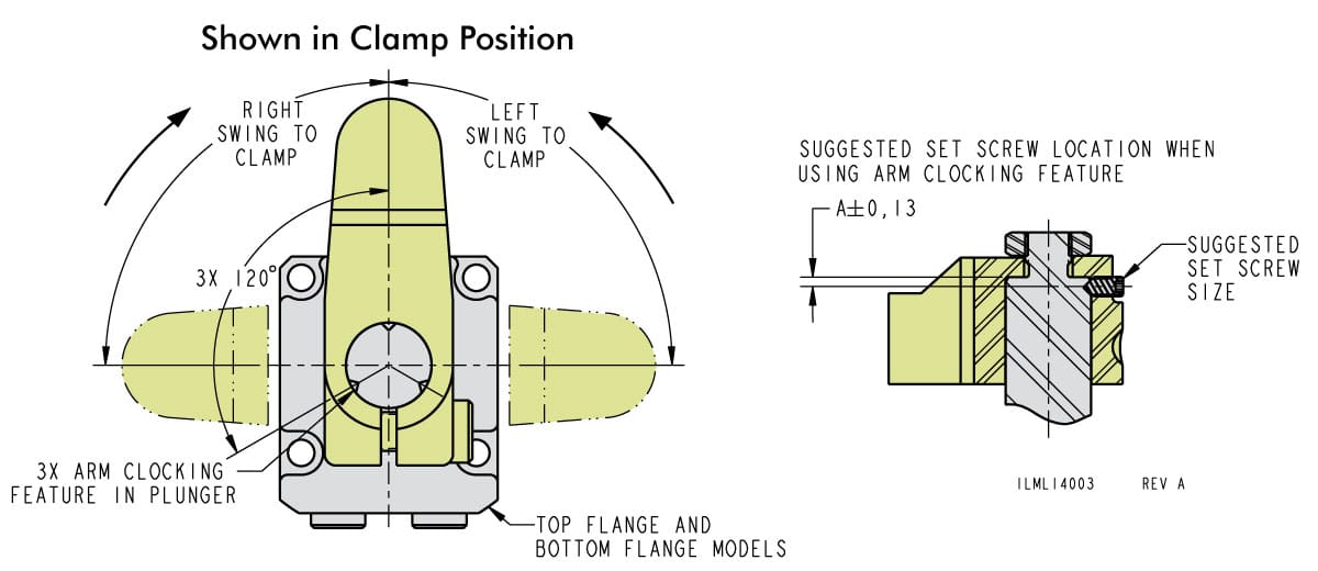TuffCam™ 7 MPa is a single direction tri-cam design swing clamp. These clamps produce the strength and reliability to support faster speeds and larger arms. TuffCam™ 7 MPa delivers notably better accuracy and repeatability over other brands. The clocking feature, dramatically reduces the time it takes to change arms for maintenance, replacement or design set up.