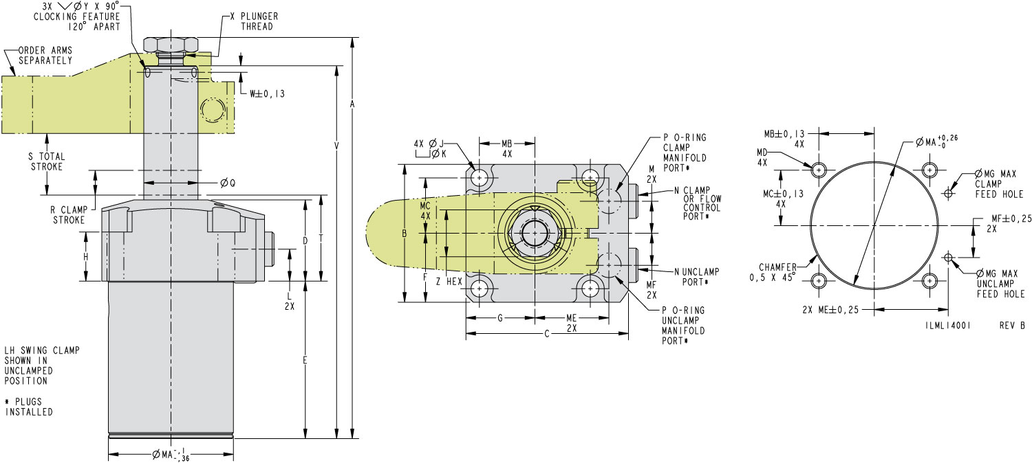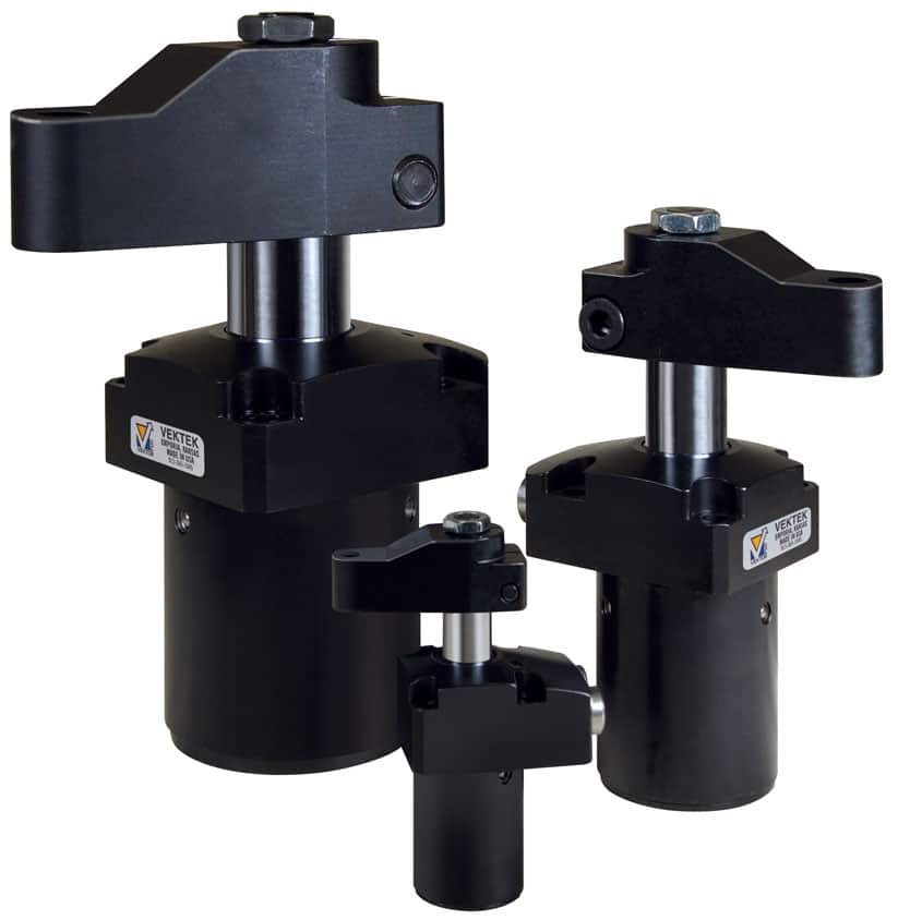 * Cylinder capacities are listed at 7 MPa (70 bar) operating pressure, with a standard length VektorFlo® 7 MPa arm installed. Maximum operating pressure is 10 MPa (100 bar). The minimum operating pressure is 1 MPa (10 bar). The clamping force is adjustable by varying the hydraulic system pressure. To determine the approximate output force for your application, divide the cylinder capacity shown above by 7 MPa (70 bar), and multiply the resultant number by your system operating pressure MPa (bar) to obtain the approximate clamping force for your application. (Actual force will vary slightly due to internal cantilever loading, and/or friction loss.)
