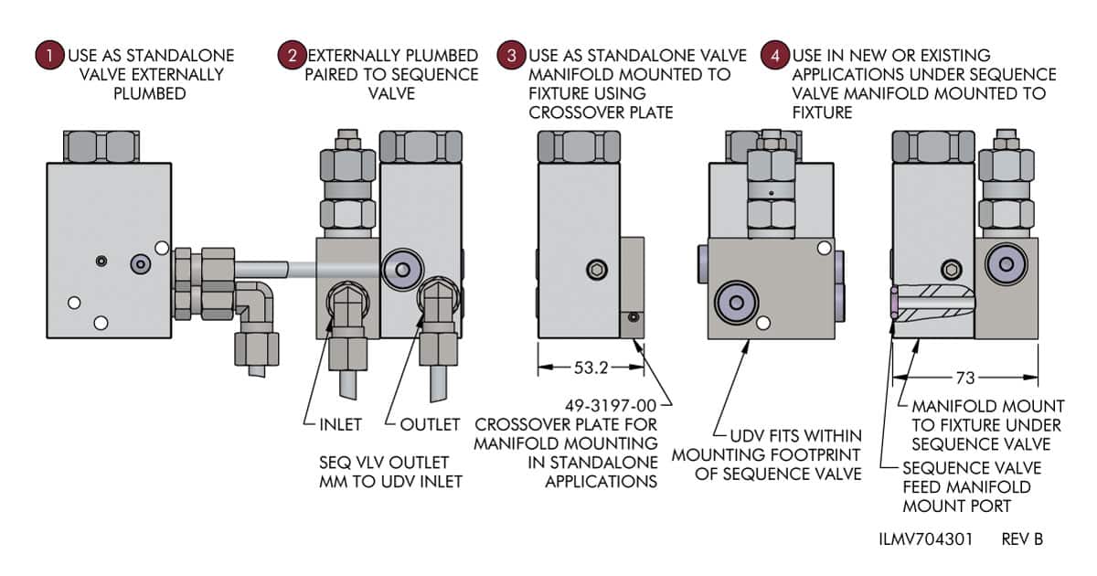 - Conveniently mounts between the Vektek Sequence Valve and the fixture manifold (for sequenced operation downstream) or can be ported with fittings and tubing.