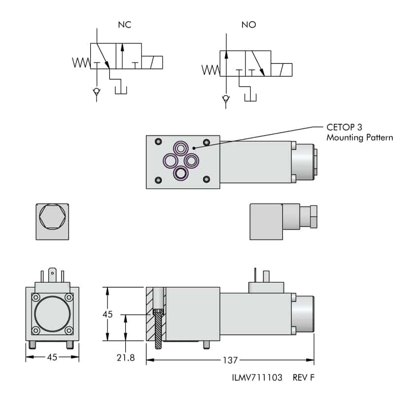 | 47-1115-03 | Normally Closed | CETOP 3 | 24 VDC | 28 Watts | 100% | 2000/hr | 85-5342-91 |