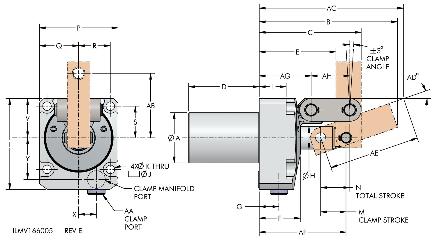 * Clamp capacities are listed at 350 bar (35 MPa) maximum operating pressure with a standard length link clamp lever installed. See the TuffLink Link Clamp Levers for the clamping force of various lever lengths and pressures. Minimum operating pressure is 52 bar (5.2 MPa) for single acting devices. The clamping force is adjustable by varying the hydraulic system pressure. (Actual force will vary slightly due to mechanical inefficiencies, friction and/or return springs.)