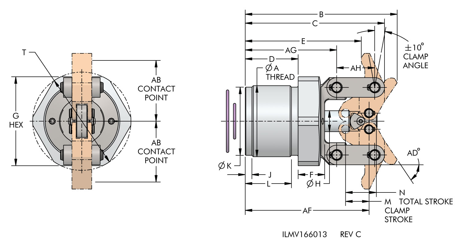 * Clamp capacities are listed at 350 bar (35 MPa) maximum operating pressure with a standard length link clamp lever installed. See the TuffLink Link Clamp Levers for the clamping force of various lever lengths and pressures. Minimum operating pressure is 52 bar (5.2 MPa) for single acting devices. The clamping force is adjustable by varying the hydraulic system pressure. (Actual force will vary slightly due to mechanical inefficiencies, friction and/or return springs.)