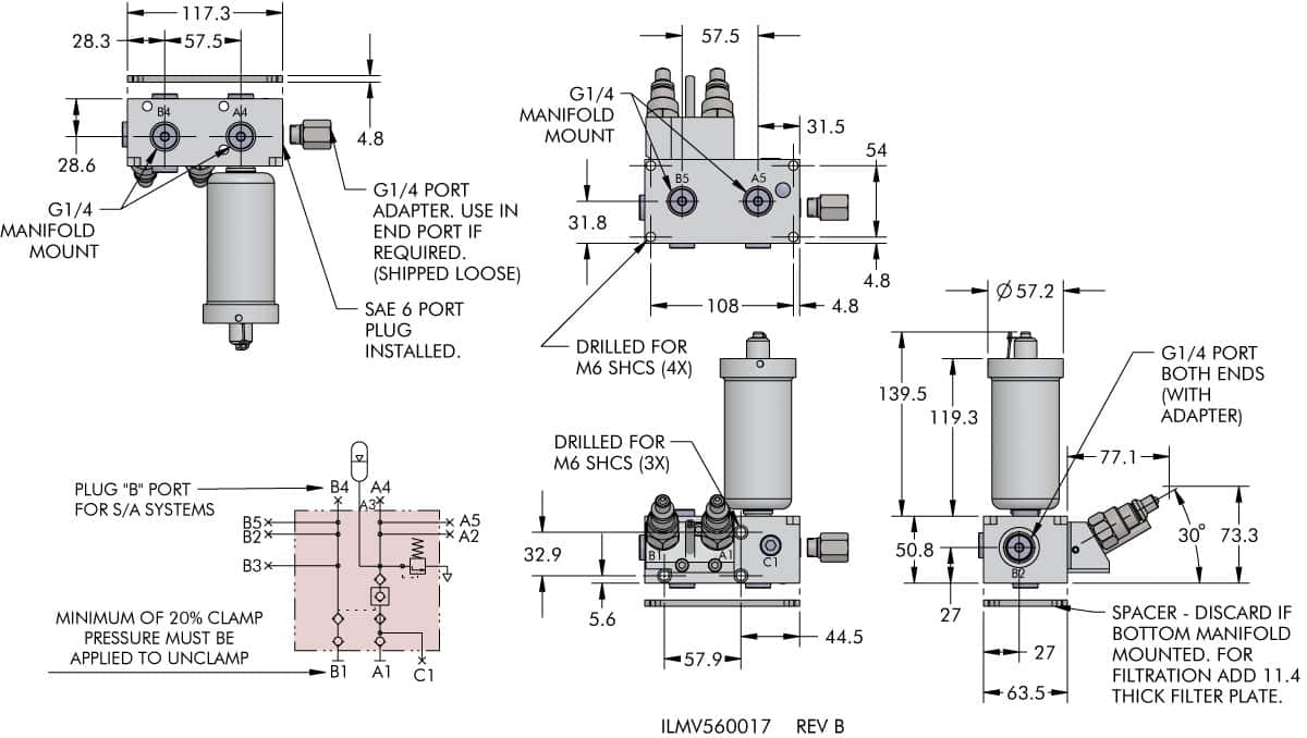 - Internal 25 micron filters for added protection of pilot operated check valve thru ports A1, A2, A3, A4 & C1. Additional filtration provided at port B1. (filtration for A3, B3 or A4, B4 available by purchasing Vektek filter block 47-0842-05 or 47-0842-06 depending on mounting orientation.)