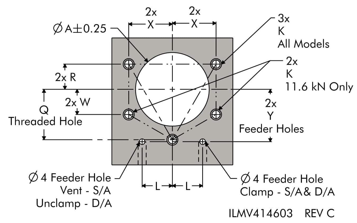 * Cylinder capacities are listed at 350 bar (35 MPa) maximum operating pressure, with a standard length VektorFlo® arm installed. Minimum operating pressure is 52 bar (5.2 MPa) for single acting, 35 bar (3.5 MPa) for double acting. The clamping force is adjustable by varying the hydraulic system pressure. To determine the approximate output force for your application, divide the cylinder capacity shown above by 350, and multiply the resultant number times your system operating pressure to obtain the approximate clamping force for your application. (Actual force will vary slightly due to internal cantilever loading, friction loss and/or return springs.)