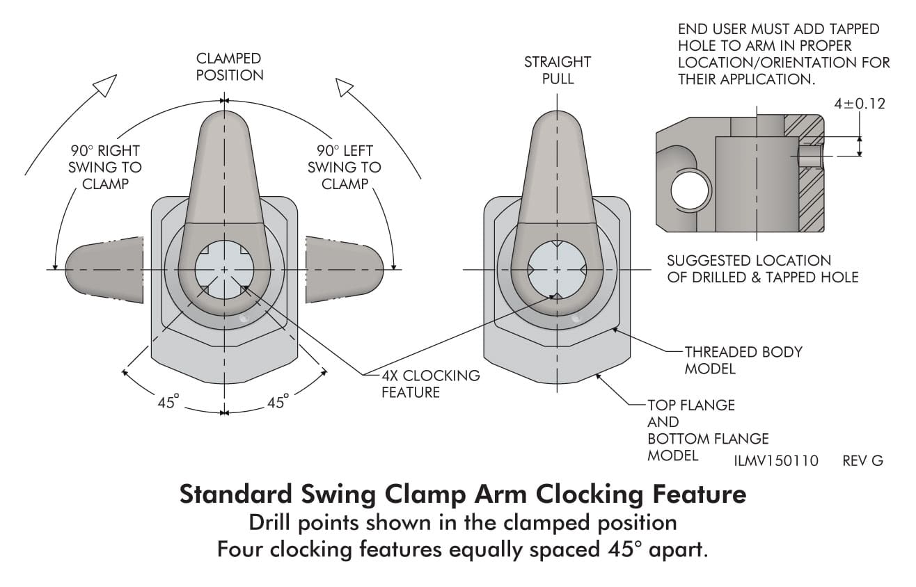 Machined on most Vektek swing clamps, the Arm Clocking feature will dramatically reduce the time it takes to change arms for maintenance, replacement or design set up. This innovation eliminates the need for expensive special swing clamps and moves cost effective user modifications to the clamp arms.