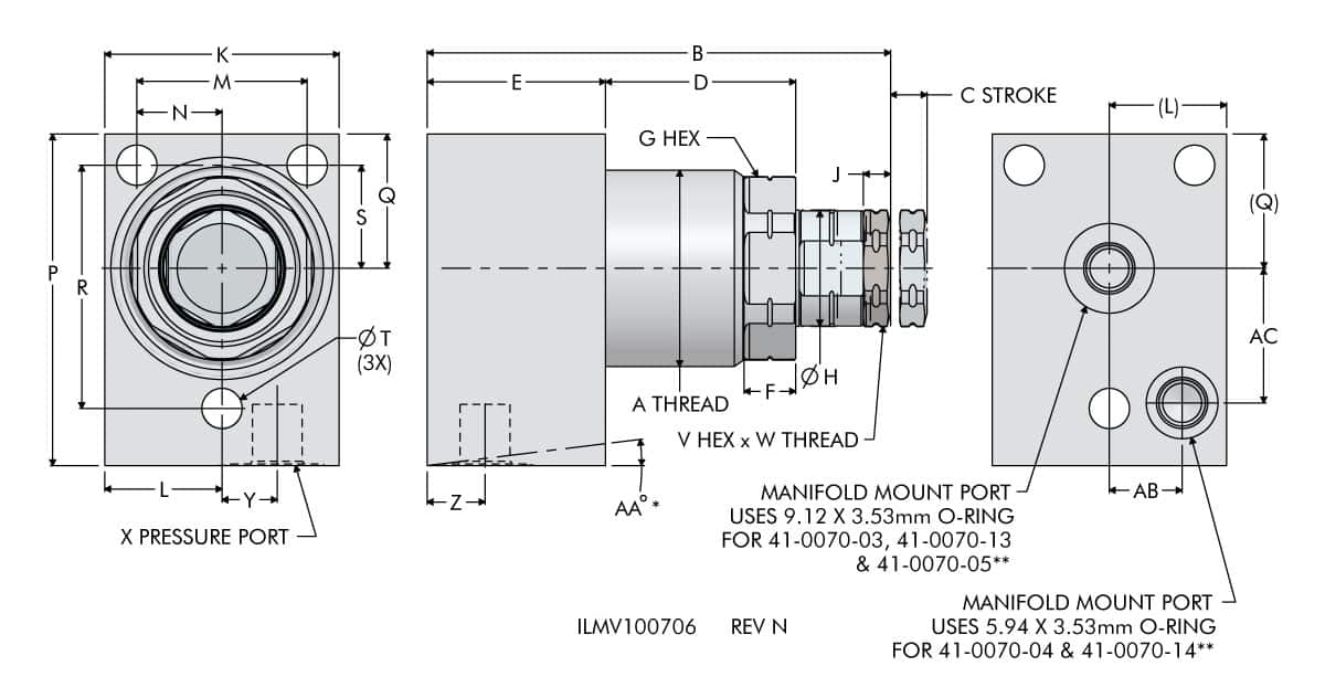 ** All models have one manifold mount pressure port that is plugged at the time of assembly. Refer to drawing ILMV100706 for the manifold mount pressure port location. For manifold mounting, remove the port plug and install the O-Ring (provided) at final installation.