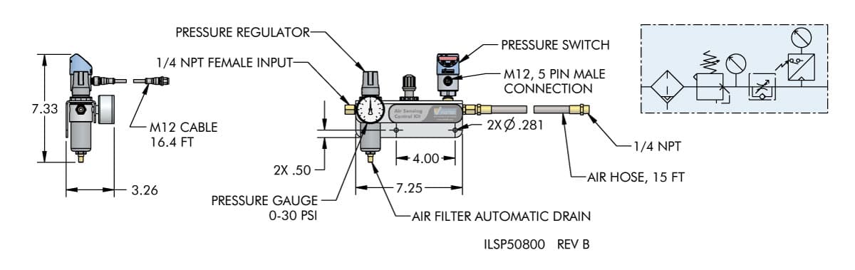 | Model No. | Max Air Pressure (psi) | Pressure Range (psi.) | Air Flow Rate (SCFM) | Filtration | Power Supply | Power Consumption | 2 Digital Contacts | 1 Analog Output |