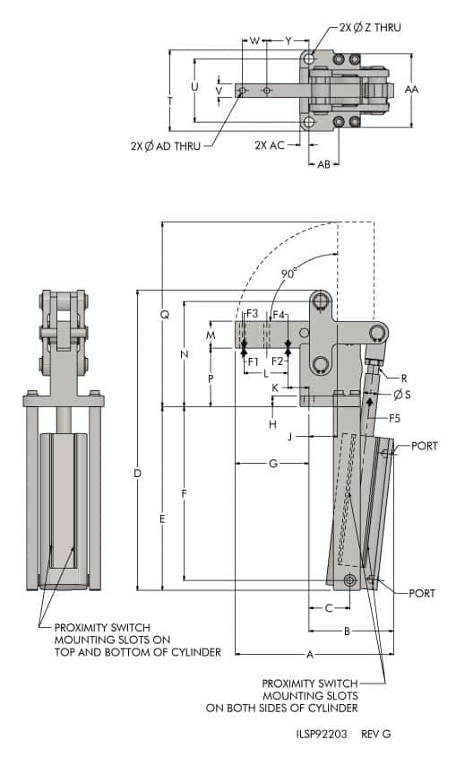 | Model No. | Size | Weight | F1 lbs. | F2 lbs. | F3 lbs. | F4 lbs. | F5 lbs. | Vn | A | B | C | D | E | F | G | H | J | K | L | M | N | P | Q | R | S | T | U | V | W | Y | Z | AA | AB | AC | AD | Stroke (in.) | Piston Dia. | Port Type |