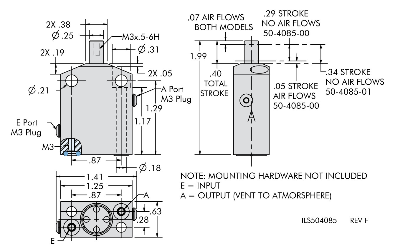 | 50-4085-00 | Over-Travel Sensing | 145 | 10 - 70 | 0.354 - 0.706 | Min. 12 | Min. 45 | 0.40 Max | 1.5 - 3 | 0.079 | Manifold & M3 |